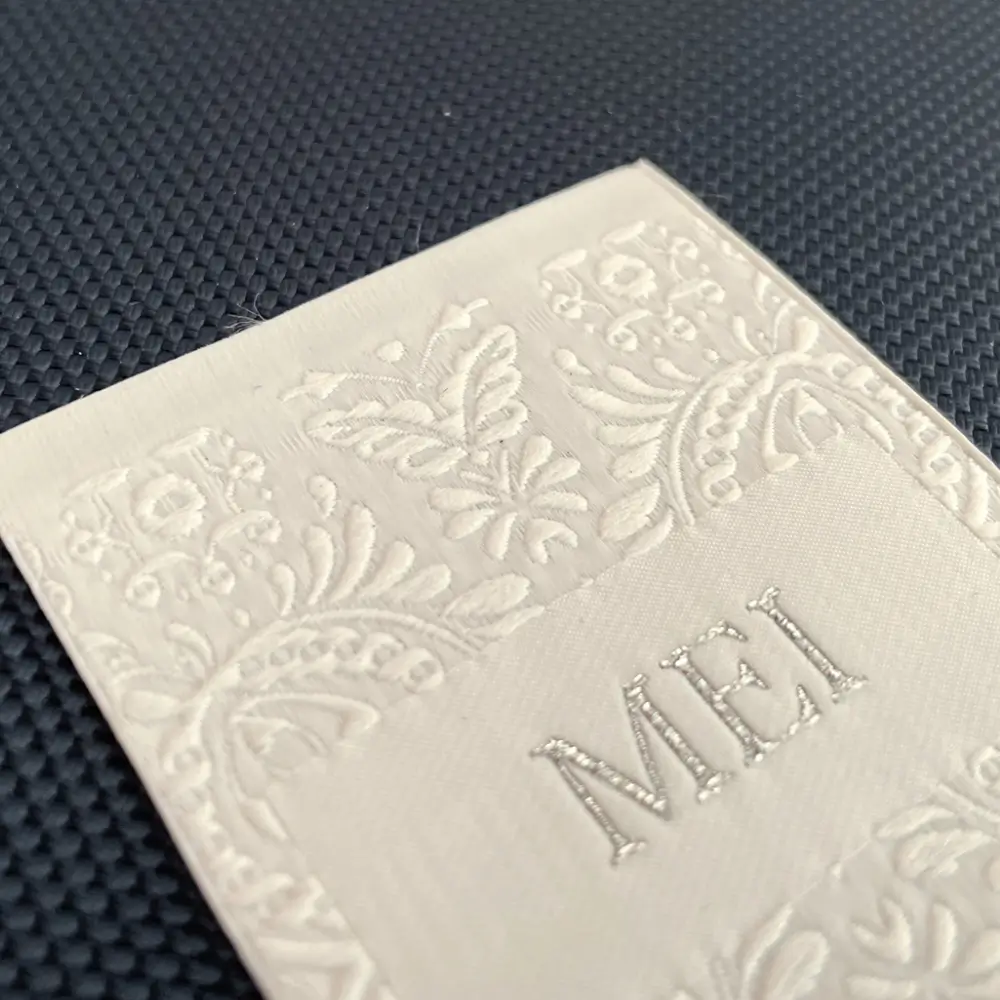An innovative label, this is MEI’s latest design, which was presented at ITMA Milan 2023. It featured a raised design that made it look like a 3D label. The label was manufactured with the “Satin Plus” loom configuration.