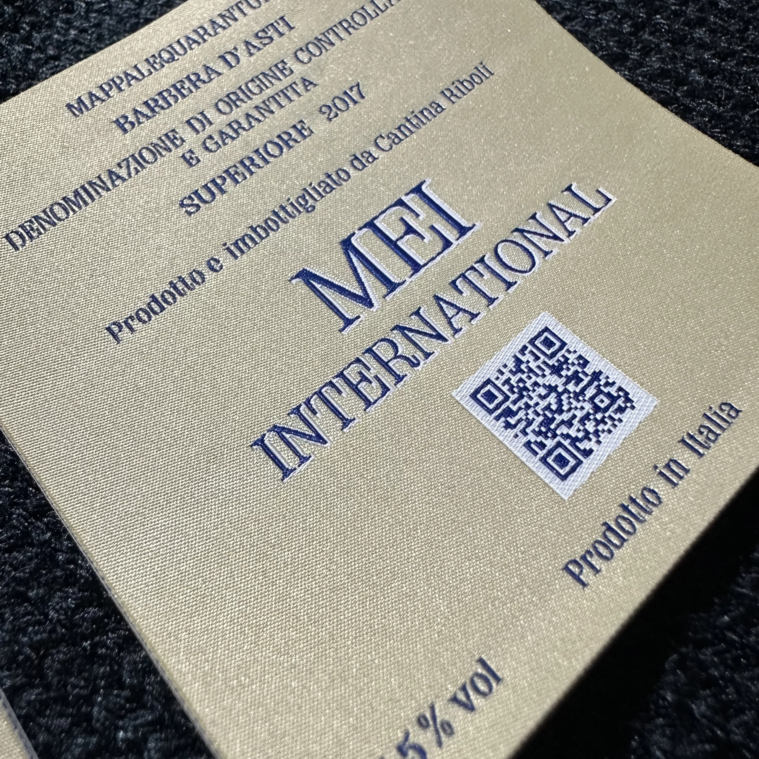This month's label is dedicated to a special celebratory edition that combines the excellence of MEI International with the tradition of Italian winemaking. Crafted with high-precision weaving, the label adorns a bottle of Barbera d'Asti Superiore 2017, a wine with Denominazione di Origine Controllata e Garantita (DOCG).