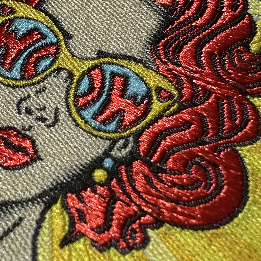 This month’s label celebrates pop style with a design inspired by 1960s comic book art. The central figure with “WOW” sunglasses instantly grabs attention, but it's the details that stand out: the vibrant red hair is woven with shiny thread, creating dynamic light effects and adding energy to the entire piece.