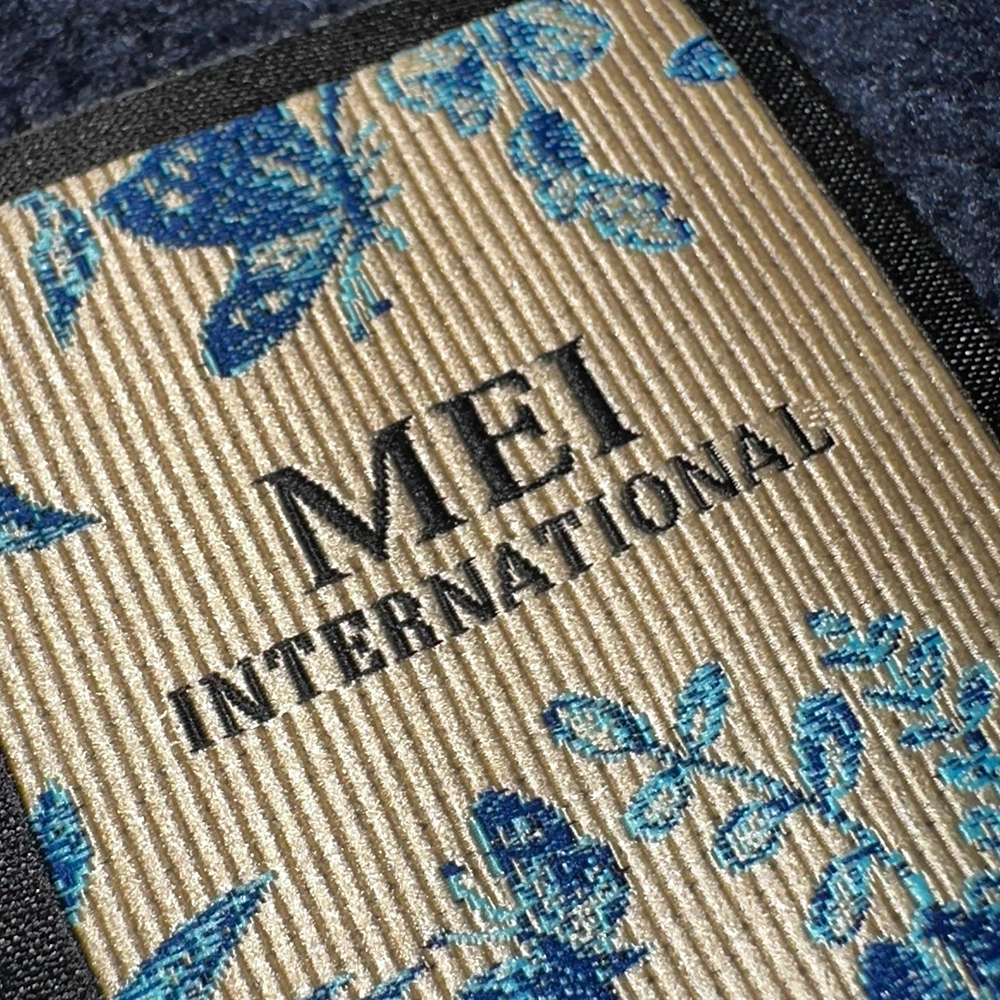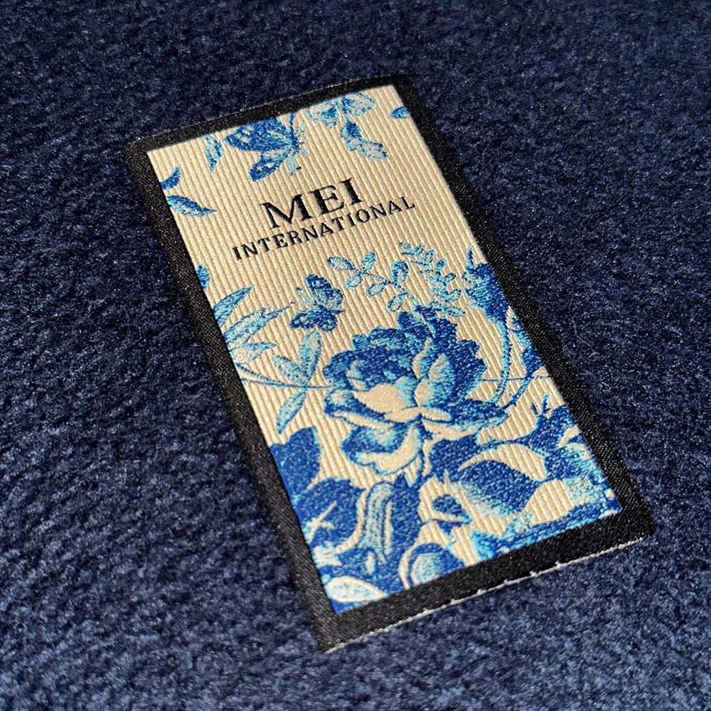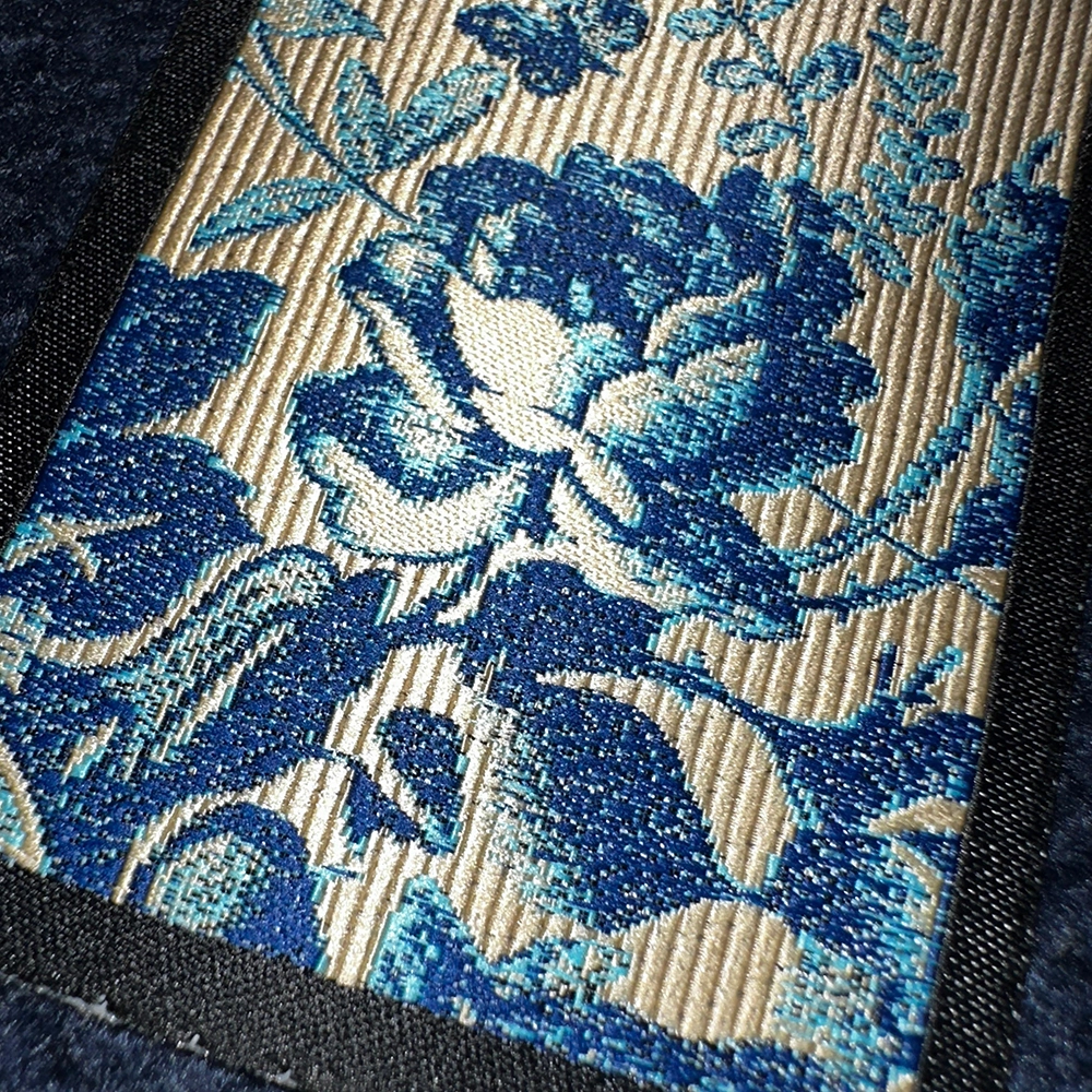 Elegante etichetta floreale in tonalità di blu su base chiara a righe creato in effetto trama, per un tocco di profondità e stile.