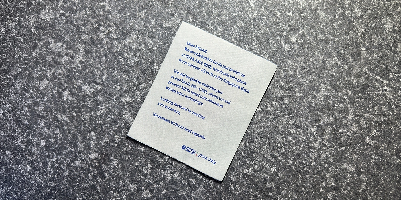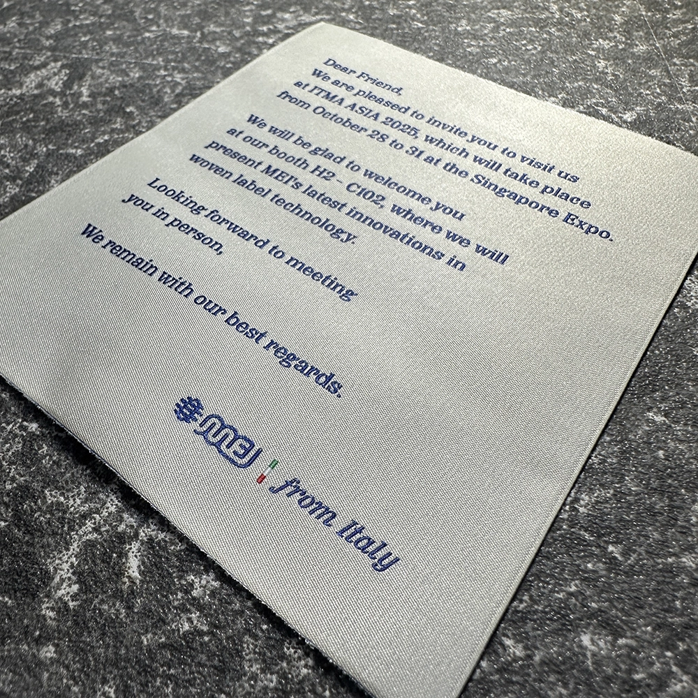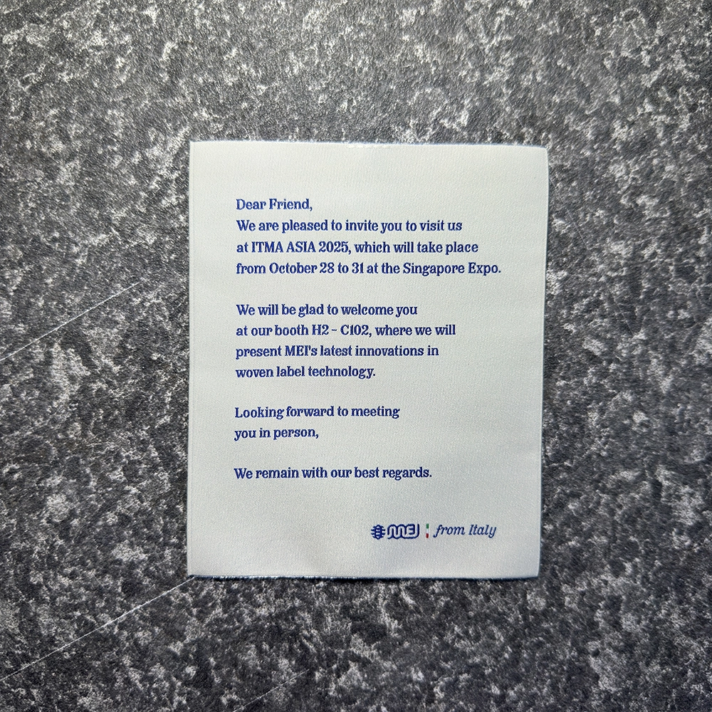 Questa etichetta speciale riproduce un invito ufficiale per ITMA ASIA 2025, che si terrà a Singapore dal 28 al 31 ottobre. Il testo, tessuto con precisione e leggibilità impeccabile, fornisce i dettagli dell’evento e dello stand MEI, dimostrando la capacità delle tecnologie MEI di realizzare scritte nitide anche su superfici ridotte.