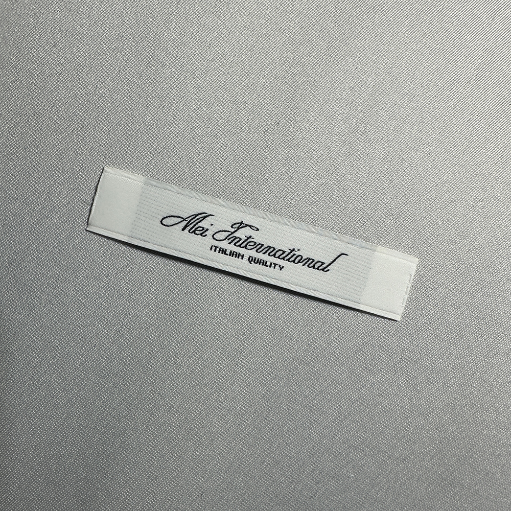 Questa etichetta presenta un design raffinato ed elegante, realizzato con una struttura ad alta densità di 180 orditi/cm. Il fondo mostra un delicato effetto ordito che valorizza la texture e la profondità visiva, mentre la scritta “Mei International” in stile corsivo dona un tocco artigianale e classico. Il claim “Italian Quality” rafforza l’identità del marchio, radicata in precisione ed eccellenza.
