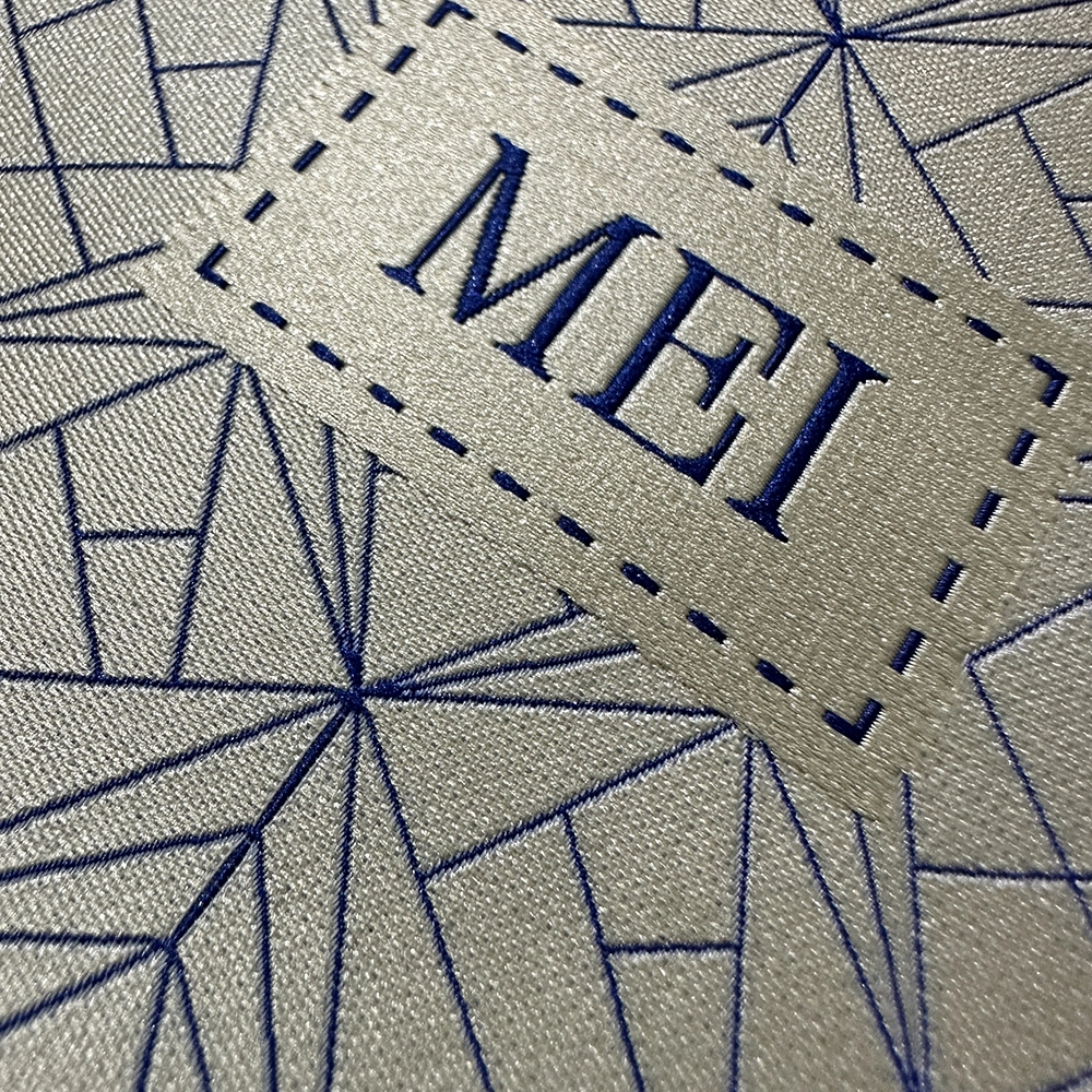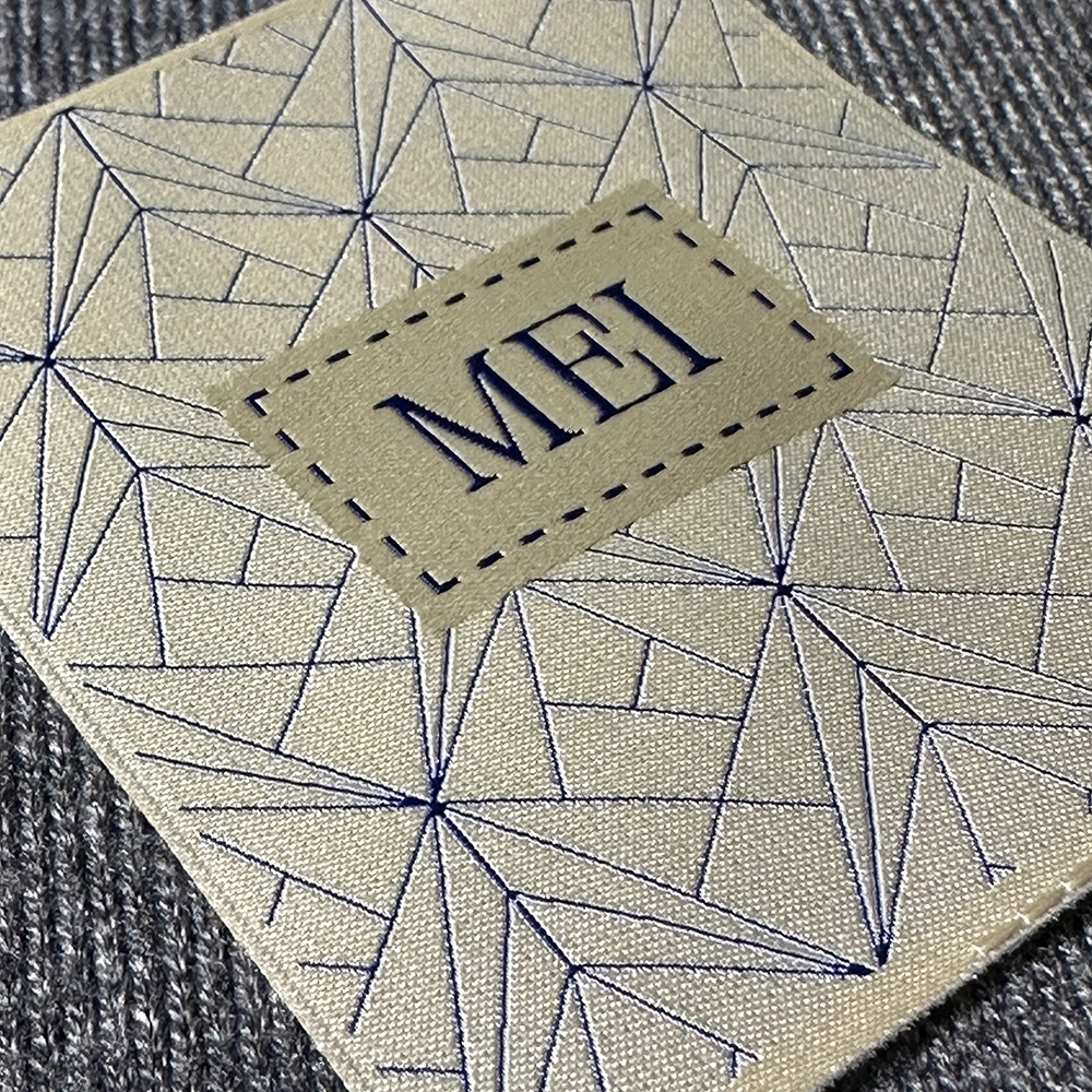 Questa etichetta del mese si distingue per il suo design raffinato, caratterizzato da un intricato motivo geometrico in tonalità blu su fondo chiaro. La precisione della tessitura garantisce dettagli nitidi e una finitura di alta qualità, espressione dell’eccellenza tecnica di MEI.