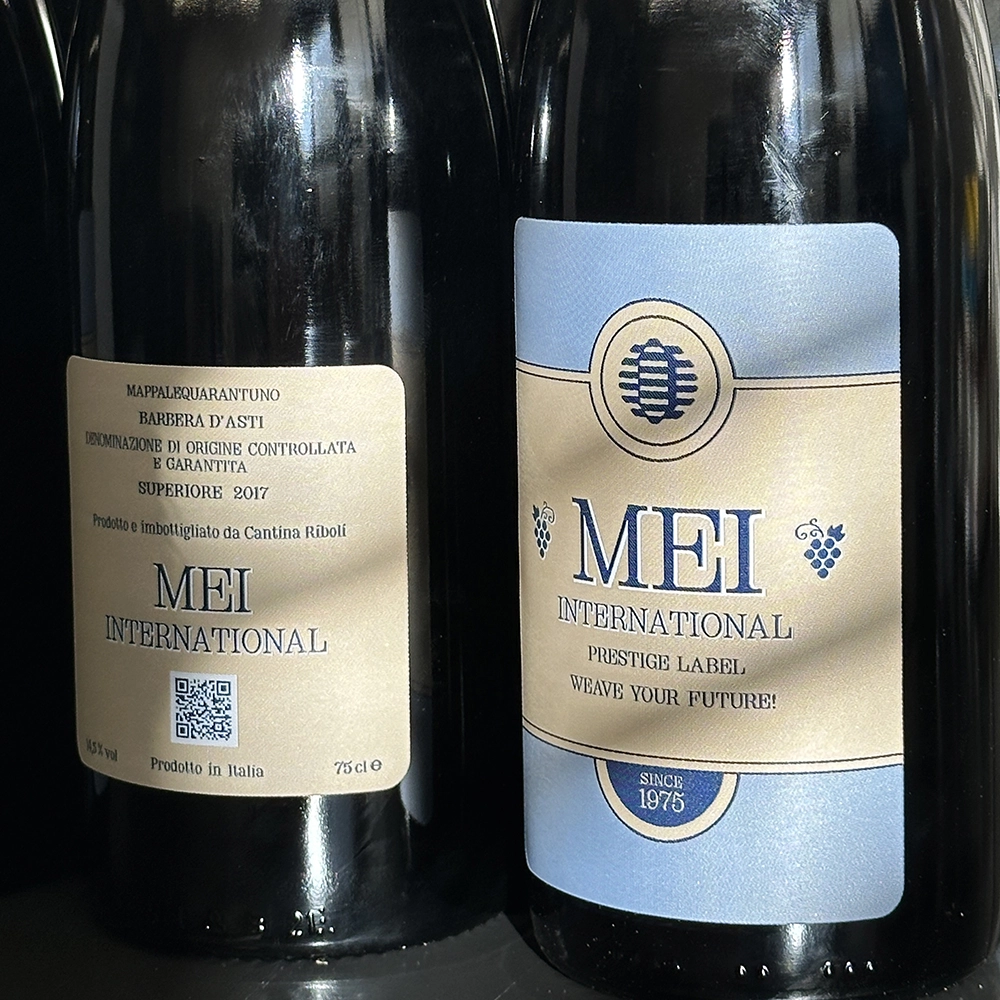 Questa etichetta del mese è dedicata a una speciale edizione celebrativa che unisce l'eccellenza di MEI International e la tradizione vitivinicola italiana. Realizzata con tessitura di alta precisione, l'etichetta adorna una bottiglia di Barbera d'Asti Superiore 2017, un vino di denominazione di origine controllata e garantita (DOCG)